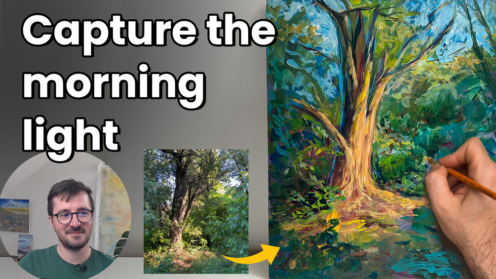 In this workshop, I take you through the full process of painting a quiet, light-filled scene from a recent morning walk. The subject is a single tree in the forest, lit by that soft glow where warm and cool tones meet.